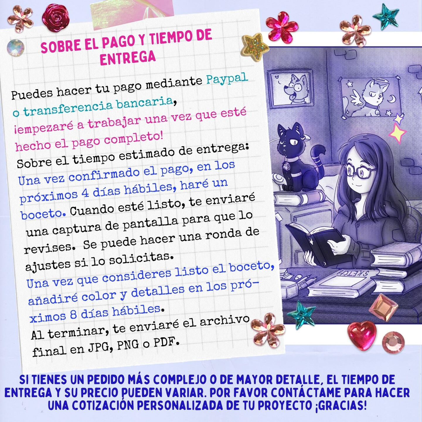 te enviaré un archivo JPG final o PDF.Todos los pedidos se realizan en un lienzo A5 en 300 DPI hecho con CLIP STUDIO PAINT.¡Este proceso tarda 12 días hábiles una vez que su pedido ha sido realizado!Por favor, pídeme permiso antes de publicar mi trabajo en otros sitios.::::::::IMPORTANTE:::::::::::HORAS DE TRABAJOMis principales horas de trabajo son de lunes a viernes, de 9 a 5 pm